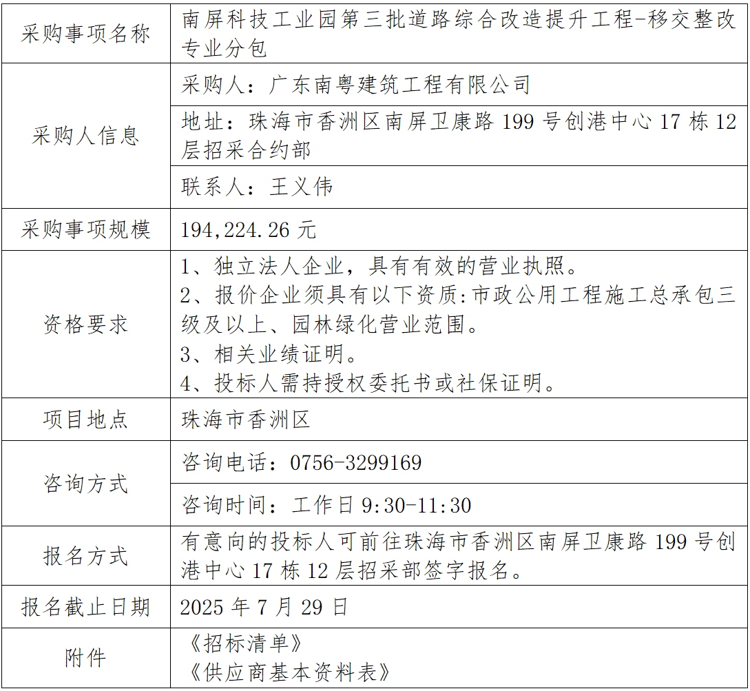 南屏科技工業(yè)園第三批道路綜合改造提升工程-移交整改專業(yè)分包 專欄:工程招標(biāo) 發(fā)布日期: 2025-07-23 作者:招采管理中心 附件:南屏科技工業(yè)園第三批道路綜合改造提升工程-移交整改專業(yè)分包招標(biāo)清單 附件:供應(yīng)商基本資料表 返回列表 上一篇:南屏科技工業(yè)園第三批道路綜合改造提升工程-移交整改專業(yè)分包(延期掛網(wǎng)) 下一篇:南屏科技工業(yè)園第二批道路綜合改造提升工程項(xiàng)目-市政排水管網(wǎng)移交整改(屏北二路飛天利商混路段)專業(yè)分包招標(biāo)