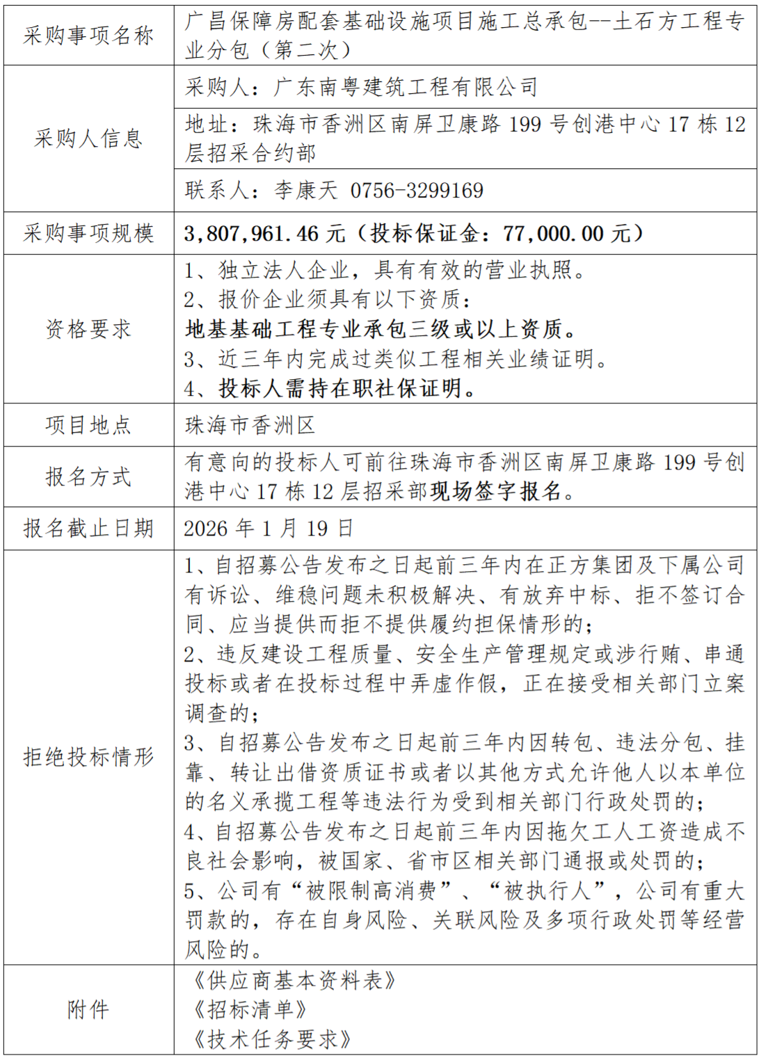 廣昌保障房配套基礎(chǔ)設(shè)施項(xiàng)目施工總承包--土石方工程專業(yè)分包(第二次) 專欄:工程招標(biāo) 發(fā)布日期: 2026-01-13 作者:招采管理中心 附件:供應(yīng)商基本資料表 附件:土石方專業(yè)分包招標(biāo)預(yù)算價(jià)清單 - 空白清單 附件:招標(biāo)技術(shù)要求(土石方工程)20260113 返回列表 上一篇:廣昌保障房配套基礎(chǔ)設(shè)施項(xiàng)目施工總承包-模板材料采購(gòu)(延期公示) 下一篇:廣昌保障房配套基礎(chǔ)設(shè)施項(xiàng)目施工總承包-食堂服務(wù)(第二次)