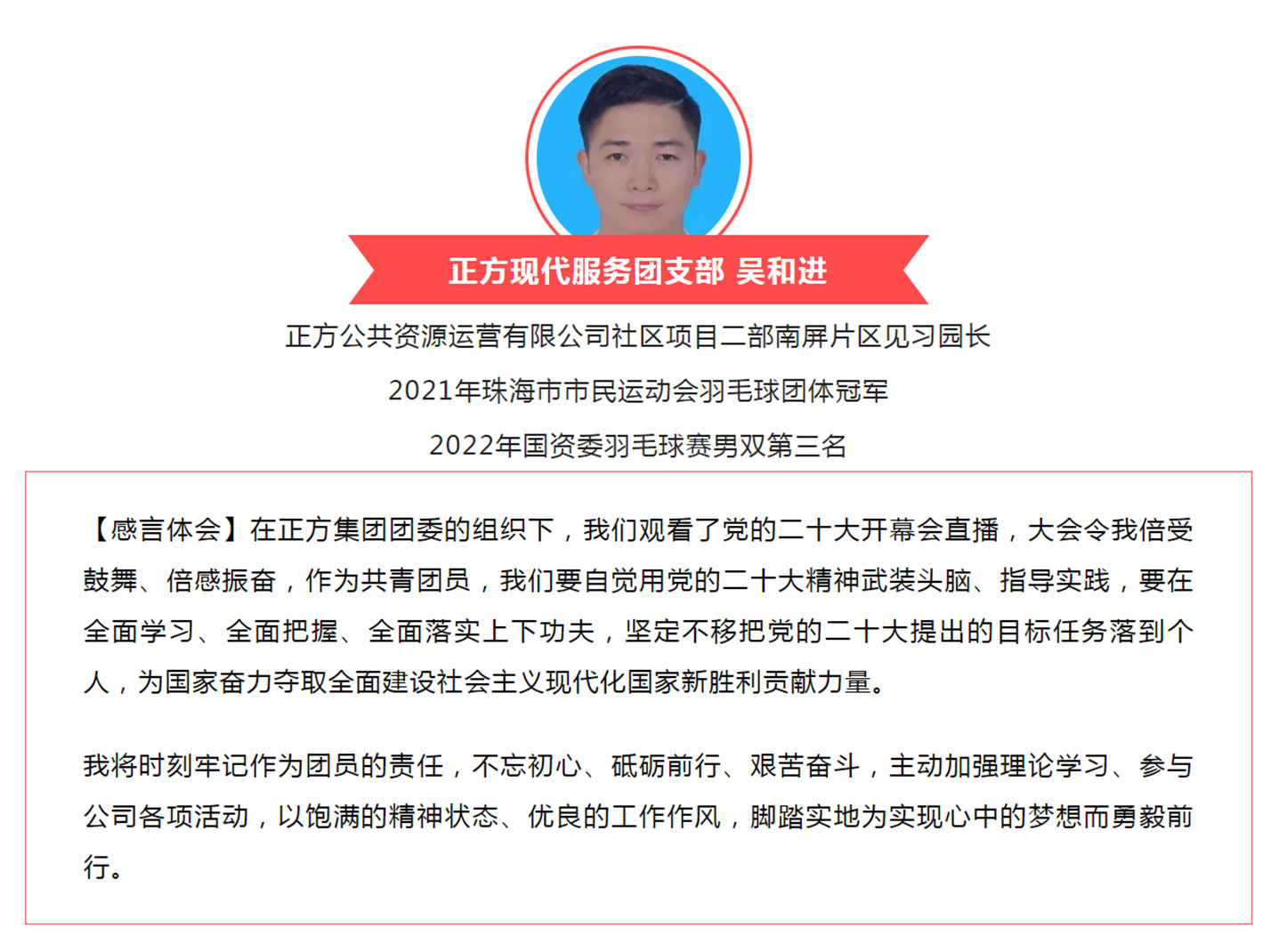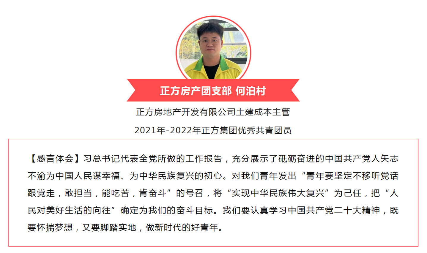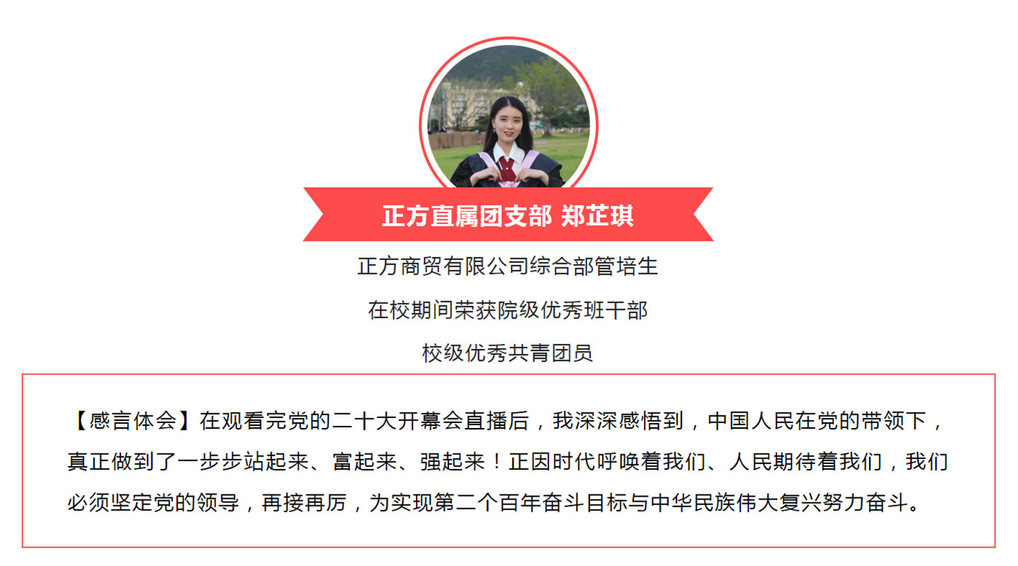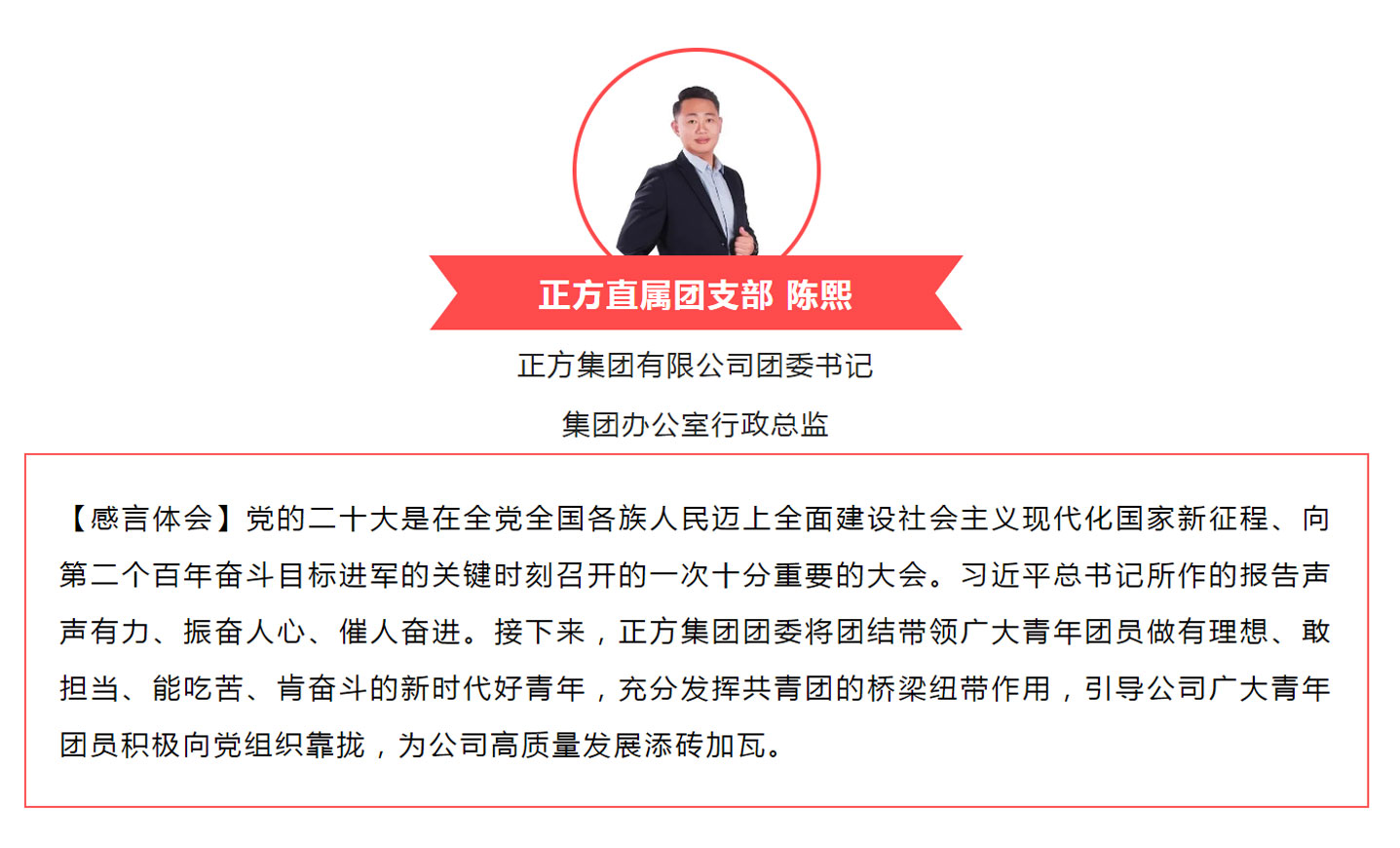 10月16日,正方集團(tuán)團(tuán)委組織各團(tuán)支部以多種形式觀看了中國共產(chǎn)黨第二十次全國代表大會(huì)開幕會(huì)直播。連日來,各團(tuán)組織圍繞習(xí)近平總書記的報(bào)告內(nèi)容開展了多次交流討論,廣大青年紛紛表示將立足本職崗位,發(fā)揚(yáng)斗爭(zhēng)精神,堅(jiān)定不移跟黨走。學(xué)習(xí)黨的二十大精神在集團(tuán)廣大青年團(tuán)員中掀起熱潮。