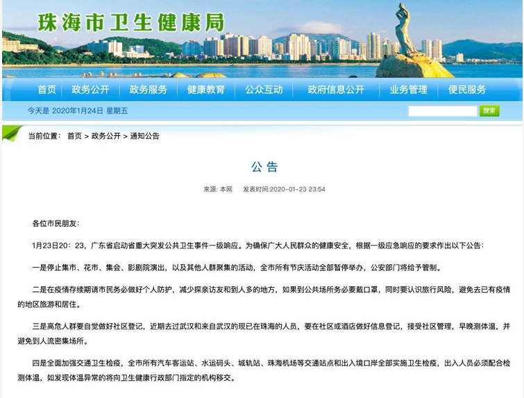 1月23日20:23,廣東省啟動(dòng)省重大突發(fā)公共衛(wèi)生事件一級(jí)響應(yīng)。為確保廣大人民群眾的健康安全,根據(jù)一級(jí)應(yīng)急響應(yīng)的要求作出以下公告: