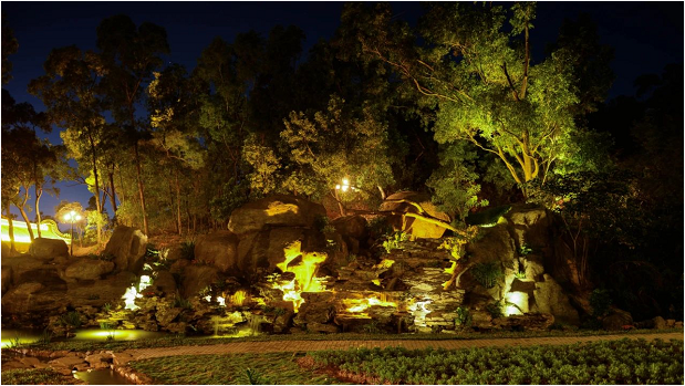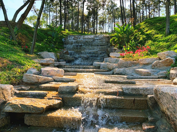水源方面,保留鳳凰山生態(tài)水資源的基礎上因地制宜,保留天然瀑布,順山勢跌級打造山泉湖水,修建環(huán)湖碧水棧道,建造人工噴泉,營造親水賞玩空間。修建攔水壩,兼具截水蓄水功能和景觀美感。