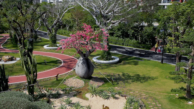 設(shè)置古樹名木區(qū)、黃槐賞花觀景帶等,精心布置沙漠綠洲、山水海底世界等主題小景。