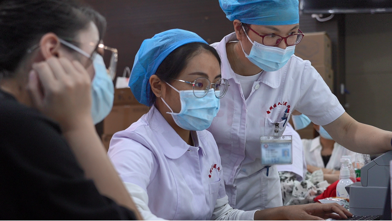 進(jìn)入接種區(qū),醫(yī)護(hù)人員再次核對身份,為對象接種新冠疫苗。