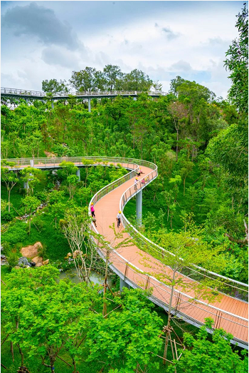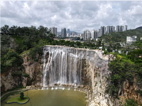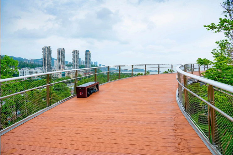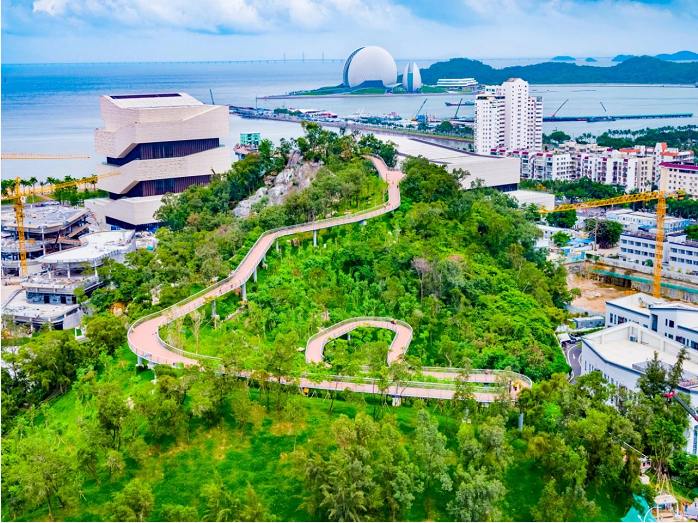 市民游客可從地面入口(珠海規(guī)劃展覽館北側(cè))徒步登上棧道,信步于山海之間,在呼吸“健康”的同時,將海天公園、日月貝、雞公山瀑布等城市美景盡收眼底,達(dá)到觀水觀城、通山達(dá)海、步移景異的景觀效果。