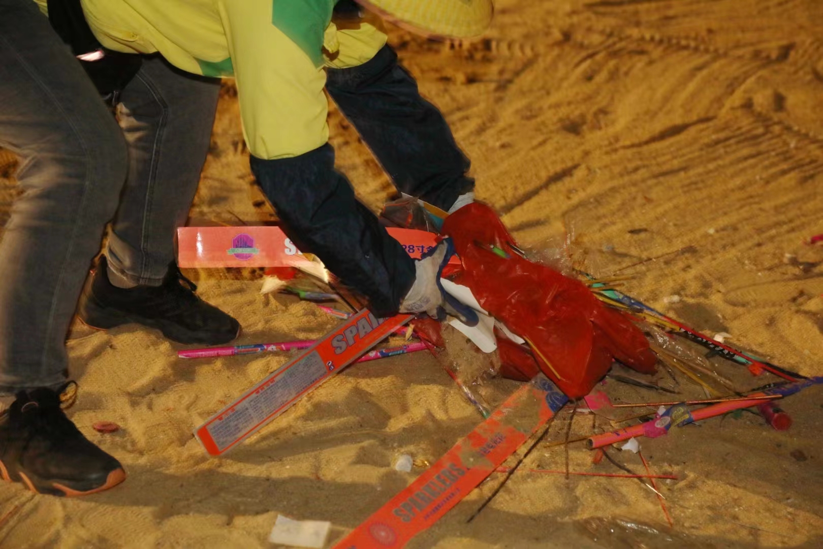 本次煙花燃放清理工作的難點區(qū)域是海天公園沙灘。大型煙花燃放后,大量的碎屑會隱藏在沙子里。為此,保潔清理隊伍分條塊對海灘進行仔細梳理清潔,靠人力一點點撿拾,將沙子里混雜的煙花爆竹碎屑梳理出來,然后用拖運車轉(zhuǎn)運至集中存放點。