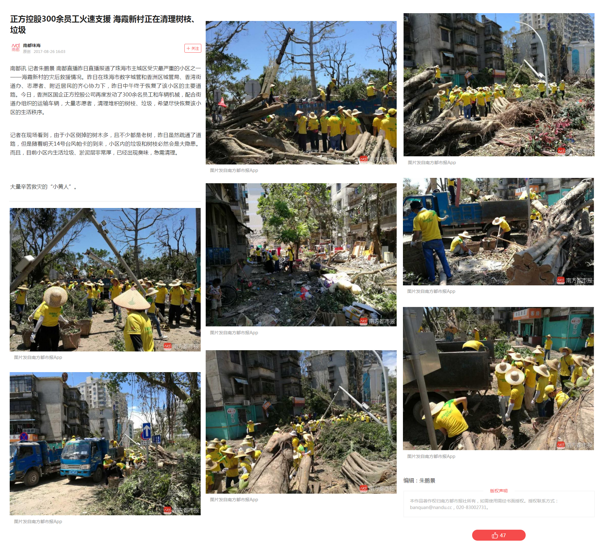 南方都市報:正方控股300余員工火速支援 海霞新村正在清理樹枝、垃圾