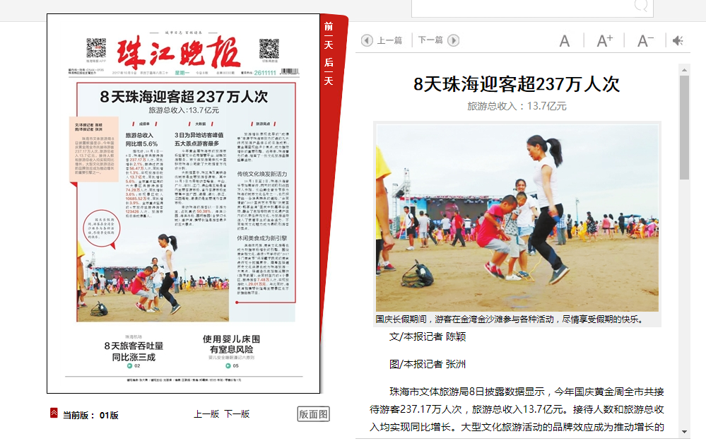 珠海市文體旅游局8日披露數(shù)據(jù)顯示,今年國慶黃金周全市共接待游客237.17萬人次,旅游總收入13.7億元。接待人數(shù)和旅游總收入均實(shí)現(xiàn)同比增長。大型文化旅游活動的品牌效應(yīng)成為推動增長的重要引擎之一。