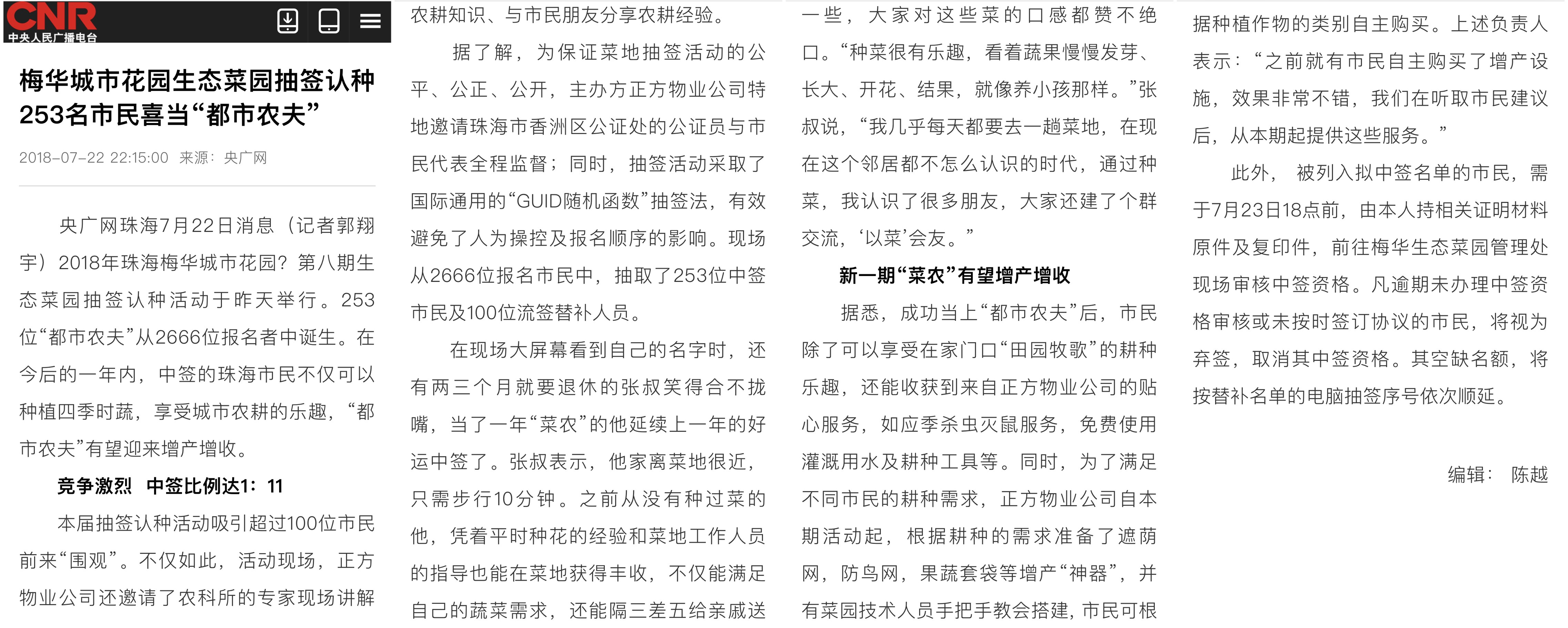 據(jù)了解,為保證菜地抽簽活動的公平、公正、公開,主辦方正方物業(yè)公司特地邀請珠海市香洲區(qū)公證處的公證員與市民代表全程監(jiān)督;同時,抽簽活動采取了國際通用的“GUID隨機函數(shù)”抽簽法,有效避免了人為操控及報名順序的影響?,F(xiàn)場從2666位報名市民中,抽取了253位中簽市民及100位流簽替補人員。