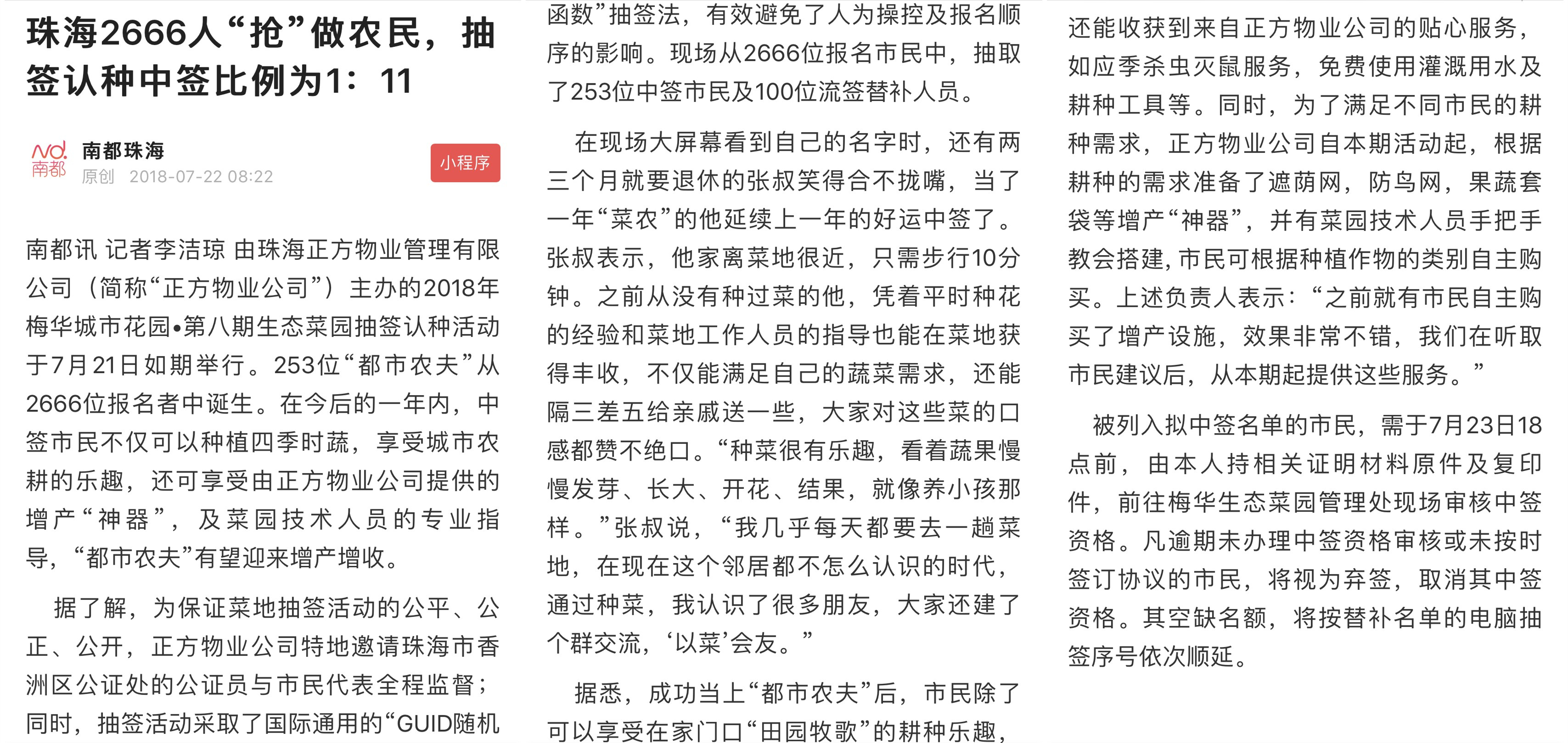 由珠海正方物業(yè)管理有限公司(簡稱“正方物業(yè)公司”)主辦的2018年梅華城市花園?第八期生態(tài)菜園抽簽認種活動于7月21日如期舉行。253位“都市農夫”從2666位報名者中誕生。在今后的一年內,中簽市民不僅可以種植四季時蔬,享受城市農耕的樂趣,還可享受由正方物業(yè)公司提供的增產“神器”,及菜園技術人員的專業(yè)指導,“都市農夫”有望迎來增產增收。