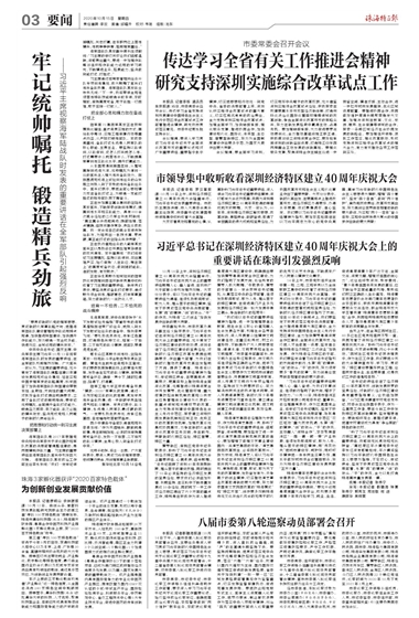 10月14日上午,深圳經(jīng)濟(jì)特區(qū)建立40周年慶祝大會(huì)隆重舉行。習(xí)近平總書記在慶祝大會(huì)上的重要講話鼓舞人心、催人奮進(jìn),在我市廣大干部群眾中引發(fā)強(qiáng)烈反響。大家紛紛表示,將以習(xí)近平總書記的重要講話為遵循,繼續(xù)弘揚(yáng)敢闖敢試、敢為人先、埋頭苦干的特區(qū)精神,堅(jiān)定不移貫徹落實(shí)黨中央決策部署,永葆“闖”的精神、“創(chuàng)”的勁頭、“干”的作風(fēng),為珠?!岸蝿?chuàng)業(yè)”加快發(fā)展作出新的更大貢獻(xiàn)。