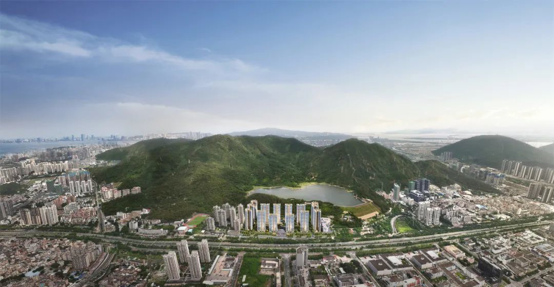 在大師團隊的妙筆下,整個項目規(guī)劃建設7棟塔樓、8棟板樓、15棟疊墅,高層圍繞南面的黑白面將軍山和南屏水庫形成為圍合之勢,將面寬1000m的湖景和5000m的山景資源最大化,實現建筑與外部環(huán)境的融合協(xié)調。