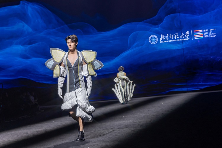 在北京師范大學(xué)未來設(shè)計(jì)學(xué)院教師劉安、許棟樑的指導(dǎo)下,宋昕睿、徐碧山、柏懿洋等學(xué)生圍繞超現(xiàn)實(shí)主義、多功能、新中式、朋克及水墨藝術(shù)等多元主題,在本次大秀的設(shè)計(jì)作品中融合可持續(xù)理念與多種設(shè)計(jì)方法,重點(diǎn)突出傳統(tǒng)與現(xiàn)代和諧共存的理念。