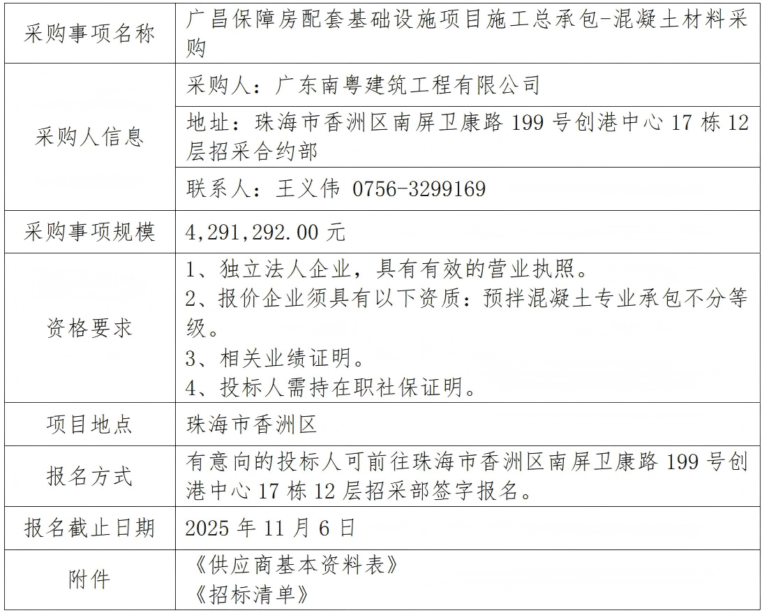 廣昌保障房配套基礎(chǔ)設(shè)施項目施工總承包-混凝土材料采購 專欄:工程招標 發(fā)布日期: 2025-11-03 作者:招采管理中心 附件:供應商基本資料表 附件:廣昌保障房配套基礎(chǔ)設(shè)施項目施工總承包-混凝土材料采購招標清單 返回列表 上一篇:廣昌保障房配套基礎(chǔ)設(shè)施項目施工總承包-實名制系統(tǒng)考勤機升級、環(huán)境監(jiān)測系統(tǒng)、視頻監(jiān)控 下一篇:鳳凰山山地步道項目(香山湖公園至海天公園段)-全線整改、維修工程專業(yè)分包(延期公示)