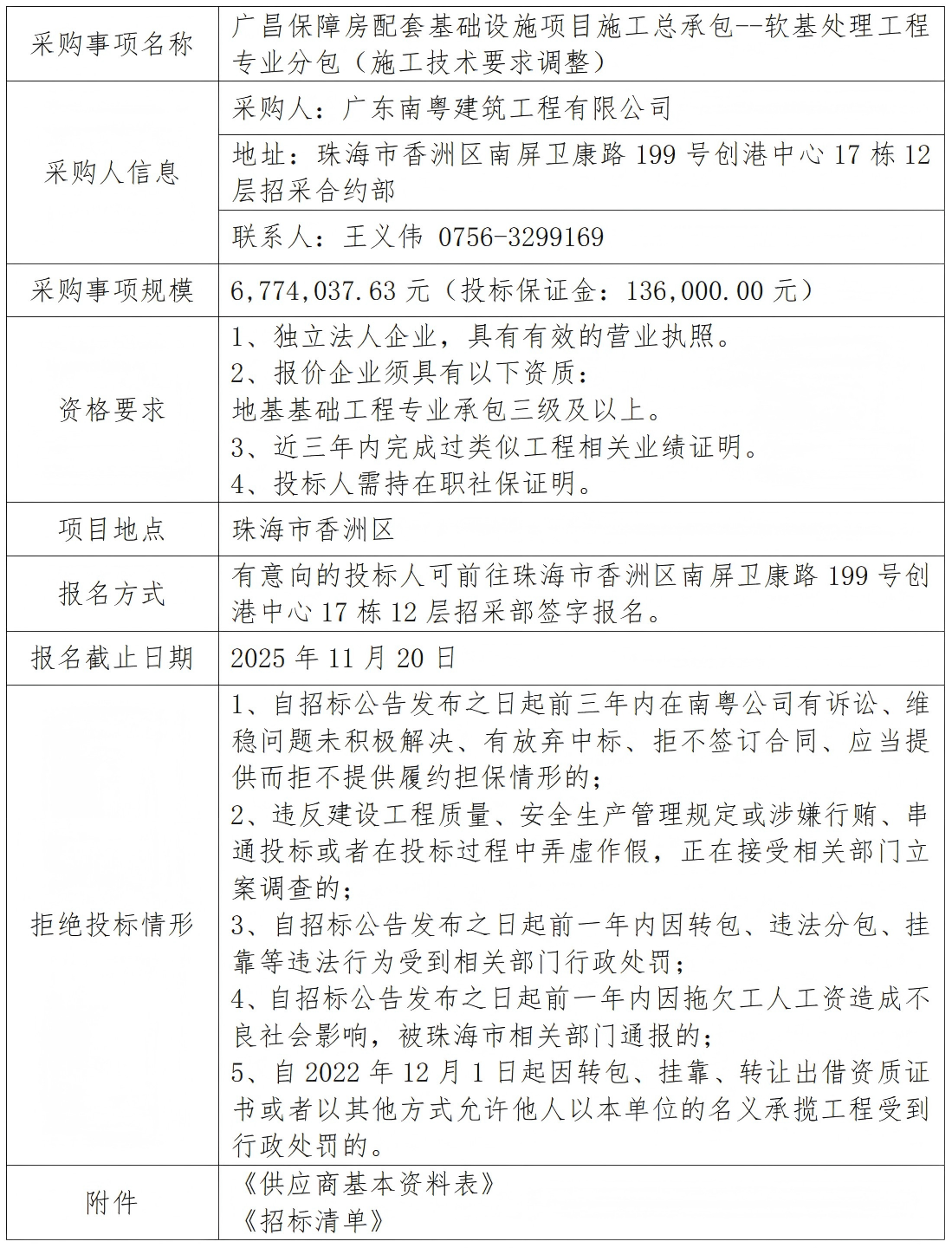 廣昌保障房配套基礎(chǔ)設(shè)施項(xiàng)目施工總承包--軟基處理工程專業(yè)分包(施工技術(shù)要求調(diào)整) 專欄:工程招標(biāo) 發(fā)布日期: 2025-11-18 作者:招采管理中心 附件:供應(yīng)商基本資料表 附件:廣昌保障房配套基礎(chǔ)設(shè)施項(xiàng)目施工總承包--軟基處理工程專業(yè)分包招標(biāo)清單 返回列表 上一篇:廣昌保障房配套基礎(chǔ)設(shè)施項(xiàng)目施工總承包-鋼板樁支護(hù)工程專業(yè)分包 下一篇:洪灣舊村更新項(xiàng)目周邊環(huán)山路等市政道路工程-波形護(hù)欄材料采購