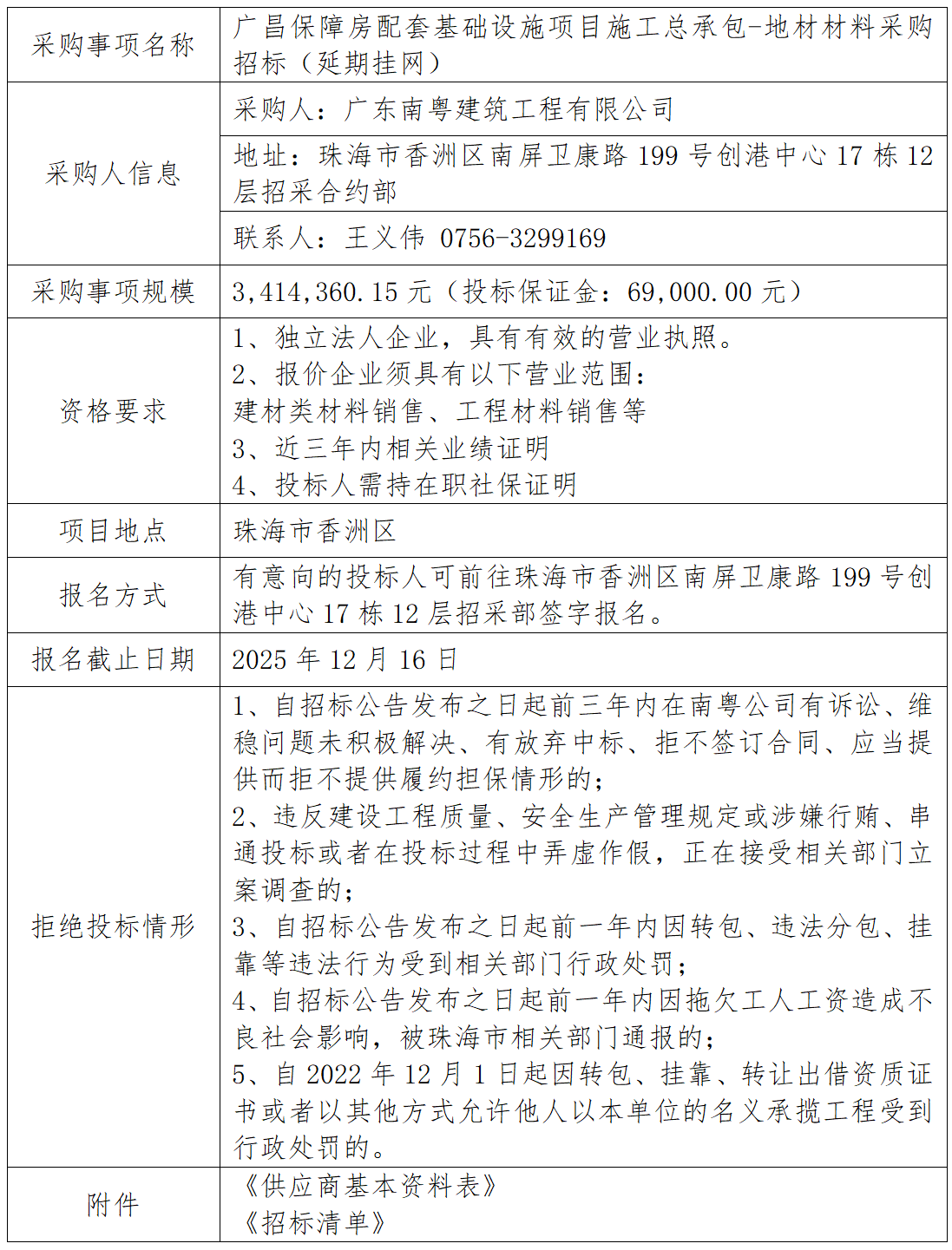 廣昌保障房配套基礎(chǔ)設(shè)施項(xiàng)目施工總承包-地材材料采購招標(biāo)(延期掛網(wǎng)) 專欄:工程招標(biāo) 發(fā)布日期: 2025-12-11 作者:招采管理中心 附件:供應(yīng)商基本資料表 附件:廣昌保障房配套基礎(chǔ)設(shè)施項(xiàng)目施工總承包-地材材料采購招標(biāo)清單 返回列表 上一篇:廣昌保障房配套基礎(chǔ)設(shè)施項(xiàng)目施工總承包-混凝土材料采購(預(yù)算、稅率變更) 下一篇:廣昌保障房配套基礎(chǔ)設(shè)施項(xiàng)目施工總承包-鋼管租賃服務(wù)