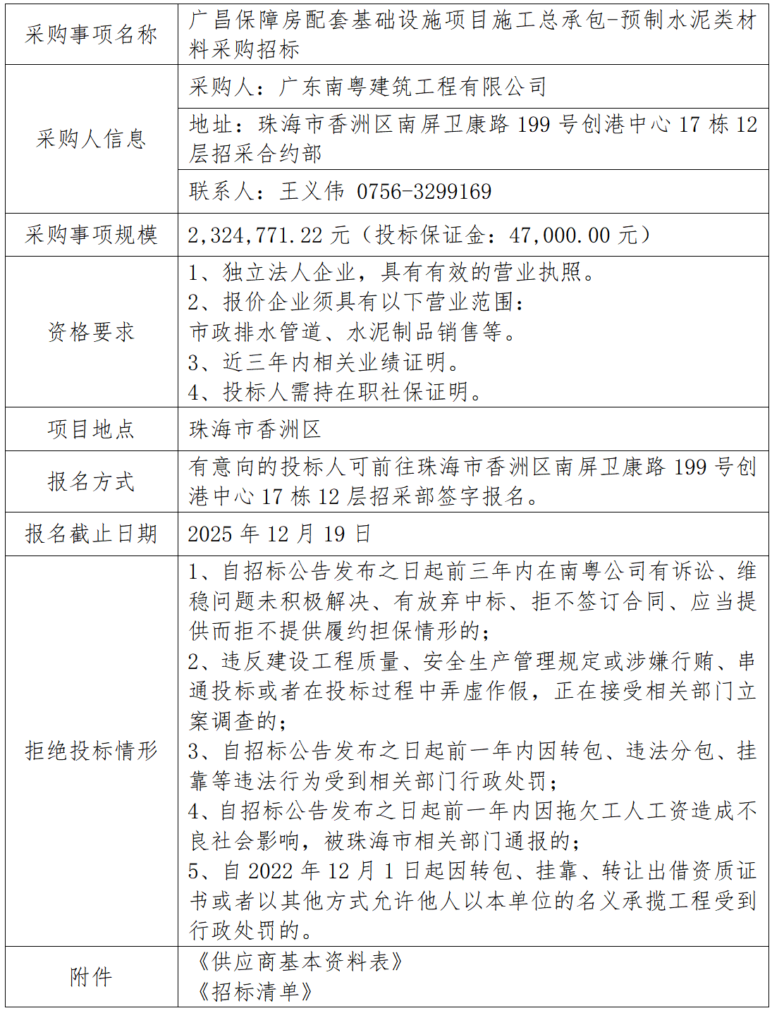 廣昌保障房配套基礎設施項目施工總承包-預制水泥類材料采購招標 專欄:工程招標 發(fā)布日期: 2025-12-16 作者:招采管理中心 附件:供應商基本資料表 附件:廣昌保障房配套基礎設施項目施工總承包-預制水泥類材料采購招標清單 返回列表 上一篇:洪灣舊村更新項目周邊環(huán)山路等市政道路工程-箱變工程專業(yè)分包 下一篇:仁恒星園-翠前路交翠峰路遷移交通信號燈項目