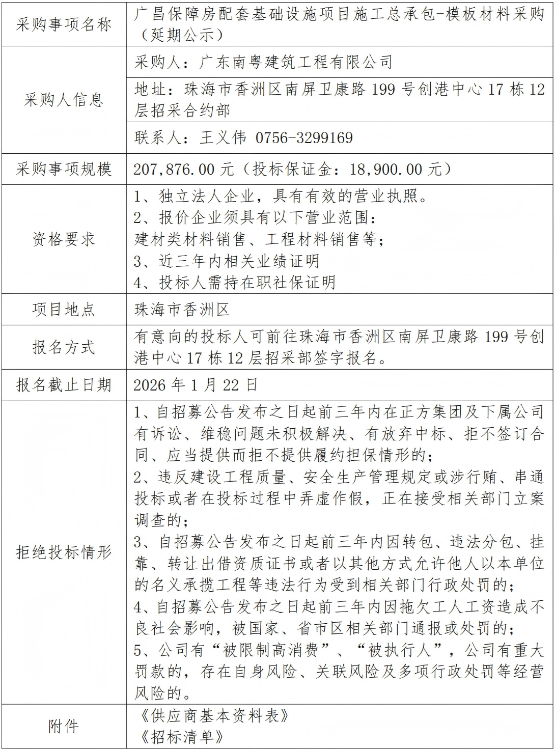 廣昌保障房配套基礎設施項目施工總承包-模板材料采購(延期公示) 專欄:工程招標 發(fā)布日期: 2026-01-19 作者:招采管理中心 附件:供應商基本資料表 附件:廣昌保障房配套基礎設施項目施工總承包-模板材料采購招標清單 返回列表 上一篇:廣昌保障房配套基礎設施項目施工總承包-預制水泥類材料采購招標(預算變更) 下一篇:廣昌保障房配套基礎設施項目施工總承包--土石方工程專業(yè)分包(第二次)
