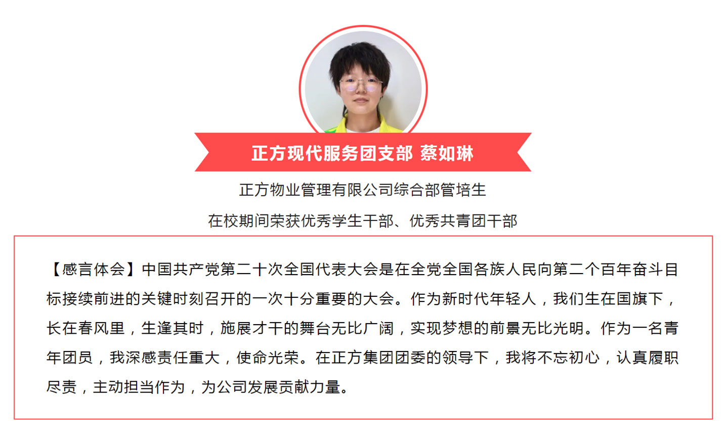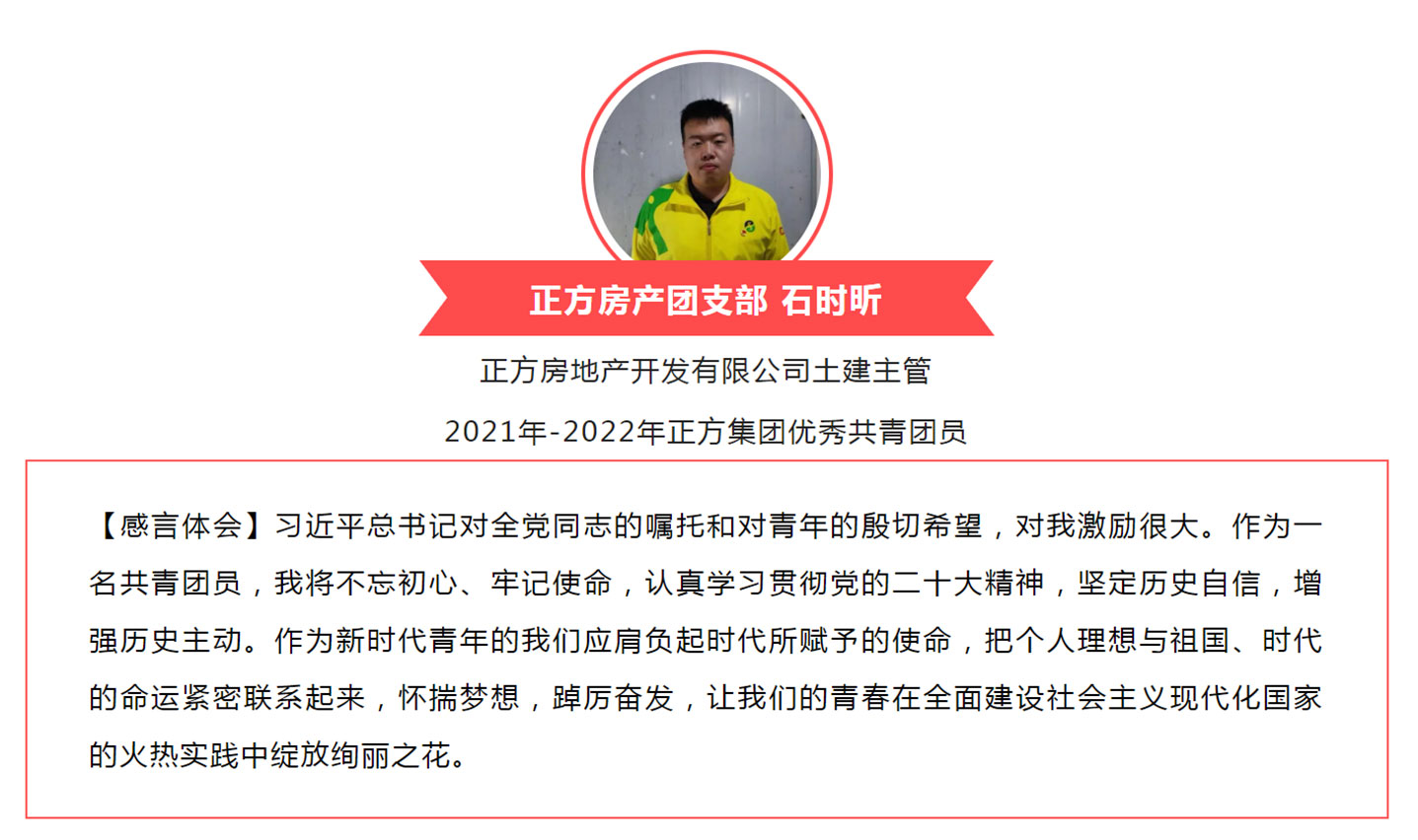 10月16日,正方集團(tuán)團(tuán)委組織各團(tuán)支部以多種形式觀看了中國共產(chǎn)黨第二十次全國代表大會(huì)開幕會(huì)直播。連日來,各團(tuán)組織圍繞習(xí)近平總書記的報(bào)告內(nèi)容開展了多次交流討論,廣大青年紛紛表示將立足本職崗位,發(fā)揚(yáng)斗爭(zhēng)精神,堅(jiān)定不移跟黨走。學(xué)習(xí)黨的二十大精神在集團(tuán)廣大青年團(tuán)員中掀起熱潮。