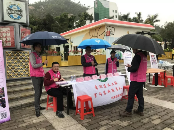 活動過程中,綿綿的小雨逐漸變大,可是這并沒有澆熄志愿者們服務(wù)的熱情,大家紛紛打起雨傘,轉(zhuǎn)移至遮蔽處,熱情地為有需要的市民朋友們提供服務(wù)。