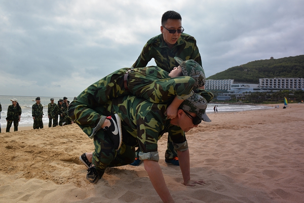 在死亡爬行中,每兩人一組,一人俯臥,另一人仰臥在下面的隊(duì)員背上,從教練規(guī)定的地點(diǎn)出發(fā),爬行15米,若著地就要從起點(diǎn)重新開始。15米,在這里似成萬里,這也是身體與意念的極限挑戰(zhàn)。英勇的“小黃人”們蒙住雙眼,四肢用力支撐,在松軟細(xì)膩的沙土中艱難前行。仰臥的隊(duì)友緊抓背負(fù)隊(duì)友的衣服,保持平衡間還要雙腿屈膝懸空。雙臂是顫抖的,雙腿是顫動(dòng)的。堅(jiān)持,堅(jiān)持,再堅(jiān)持,在這里,每一步都是突破自我,每一步都是逆境重生。每一組到達(dá)目的地的瞬間,擁抱、淚水、掌聲隨即而來。