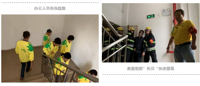 15:15時,聽到模擬消防疏散信號后,各樓層參加疏散的人員紛紛拿起消防毛巾捂住口鼻,在工作人員的指引下井然有序地沿大樓疏散通道到達指定位置,同時撥打119火警電話。巡查員現(xiàn)場查看并找到火災發(fā)生點,應(yīng)急搶險組、救護組按照分工迅速展開救援。