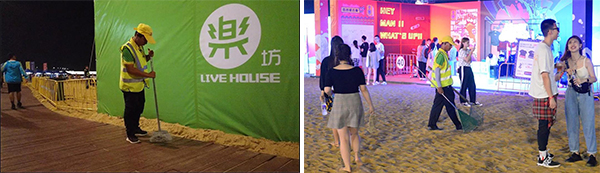 音樂節(jié)人氣爆棚,上萬觀眾匯聚狂歡。城市客廳箴言廣場、木棧道上卻十分潔凈。為了防止沙子漂上木棧道,影響觀眾行走,木棧道上每隔30米就設(shè)有一名專門的保潔員清理沙粒。
