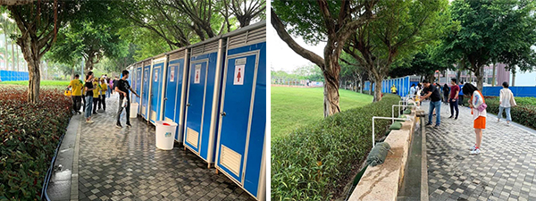 除園區(qū)本身的廁所開放,現(xiàn)場還增加了20個(gè)臨時(shí)廁所并加裝水龍頭,方便觀眾洗手。專門的清潔人員使用空氣清新劑祛除異味,保持紙巾充足。
