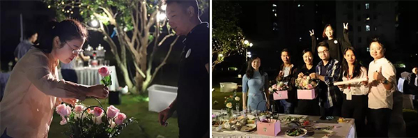 天色漸晚,嘉賓們在用餐過后兩兩配對,共同進入到最后一個環(huán)節(jié)——共剪相思花。男生剪枝,女生布置,代表著相思的花朵也在二人的呵護下驚艷綻放。完成作品后是合照環(huán)節(jié),大家有說有笑,與插好的花朵合影留“戀”。