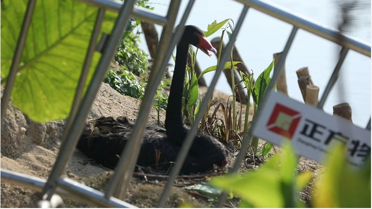 2019年11月底,工作人員在巡查中,發(fā)現(xiàn)黑天鵝在草叢中的巢里產(chǎn)下了天鵝蛋。為了能讓天鵝寶寶在適宜的溫度和生態(tài)環(huán)境下自然孵化,管理人員為它們暖心設(shè)置了鐵馬圍蔽措施以免被打擾。