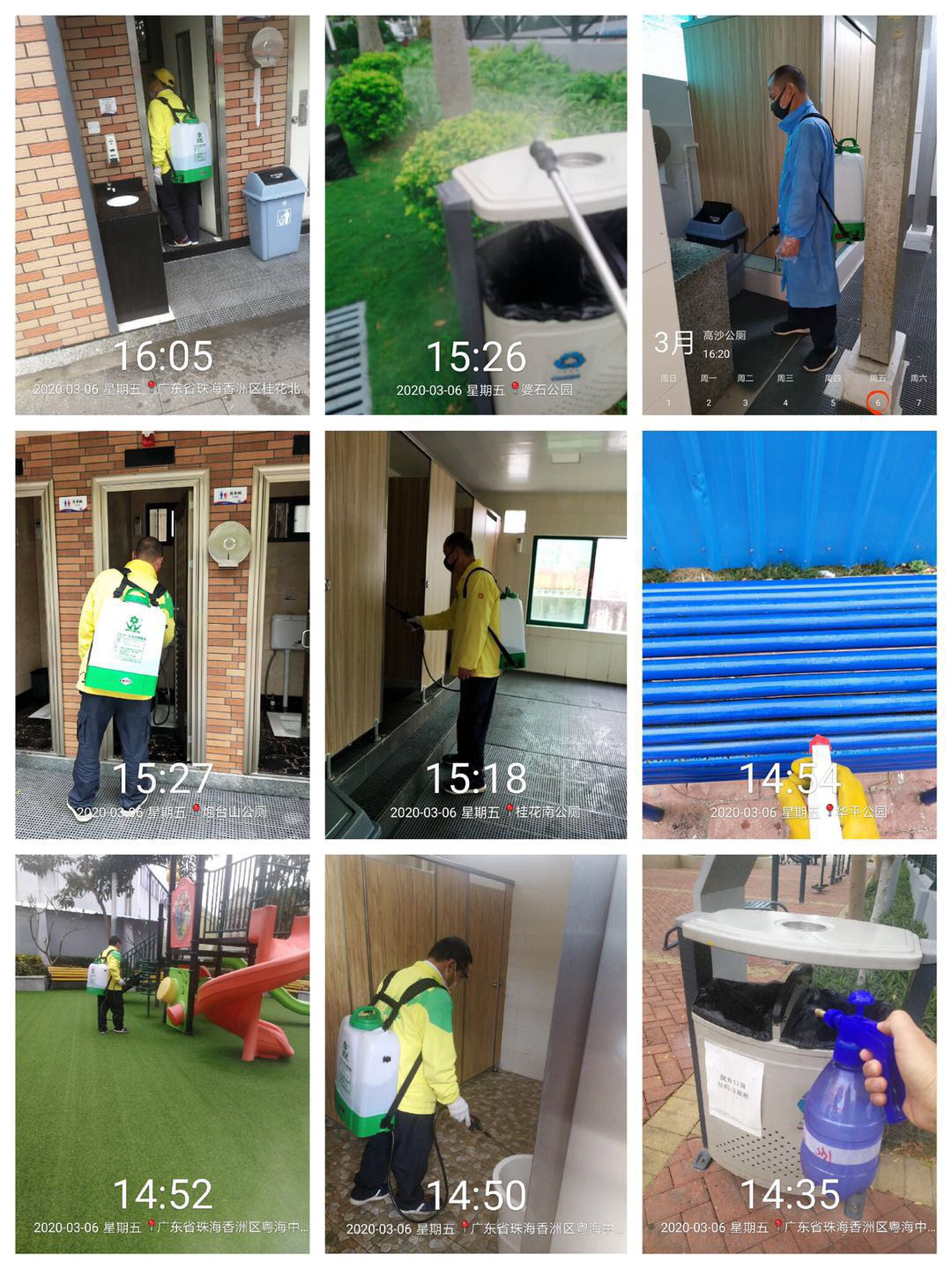 為了給市民游客提供安全舒適的游玩環(huán)境,在公園開放前,香洲正方做了大量工作。持續(xù)對管養(yǎng)的區(qū)域進行消殺工作,利用灑水車、霧炮機、噴霧器等工具,針對公廁、垃圾桶、下水道、扶手、門把手等重點位置進行重點消殺,并做好消殺記錄。在公園開放后,加大消殺頻次。