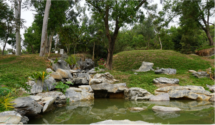 保留原有芭蕉林、楊桃林、松林、荔枝林、竹林帶等原生植被,做到“無(wú)砍伐、無(wú)新種”,降低造景成本,節(jié)約養(yǎng)護(hù)費(fèi)用。沿原有登山路線順道而設(shè)松林步道,并利用原有樹(shù)木枯枝,打造步道與荷花池欄桿。