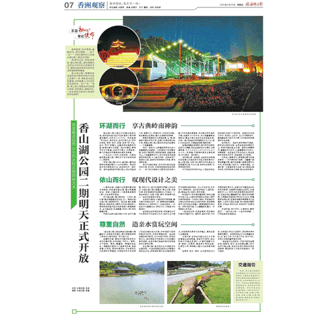 進入香山湖公園二期,首先映入眼簾的是湖中高達二十余米的噴泉。在蜿蜒的環(huán)湖棧道上漫步,可近觀魚翔淺底、群鴨戲水、賞荷聽風,也可駐足遠眺,感受青翠山巒相迎、碧水溪澗相依的美景。