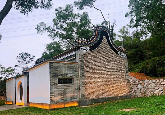 即使是藏身于一旁的衛(wèi)生間,設計上也獨具匠心——屋檐屋脊均采用灰塑裝飾,建筑山墻采用嶺南特色的鑊耳墻、蠔殼墻、花窗裝飾,十分精致。