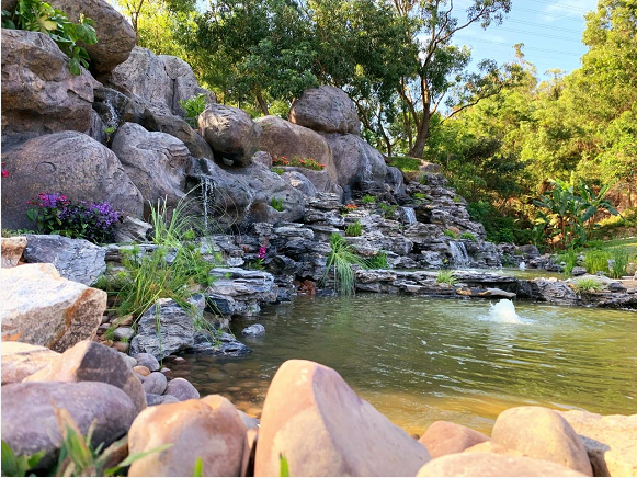 水源方面,保留鳳凰山生態(tài)水資源的基礎上因地制宜,保留天然瀑布,順山勢跌級打造山泉湖水,修建環(huán)湖碧水棧道,建造人工噴泉,營造親水賞玩空間。修建攔水壩,兼具截水蓄水功能和景觀美感。