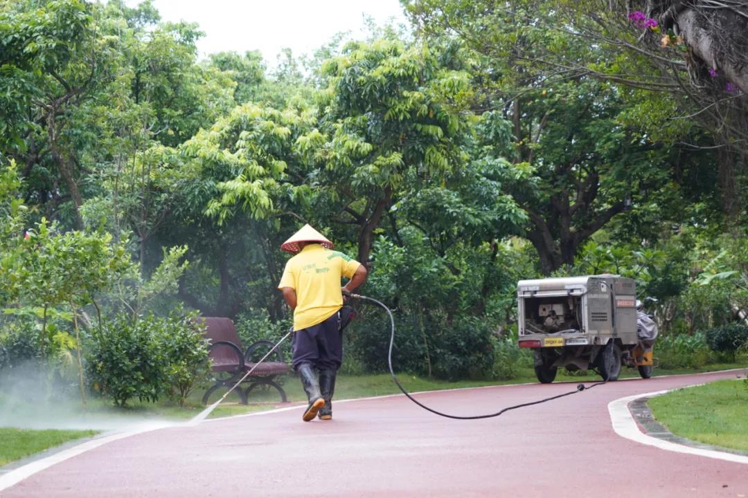 為了更好服務觀眾,香洲正方提前做好海天公園各區(qū)域的清潔工作,重點針對園區(qū)地面、溫室植物園、棧道和疊泉等位置進行清潔。