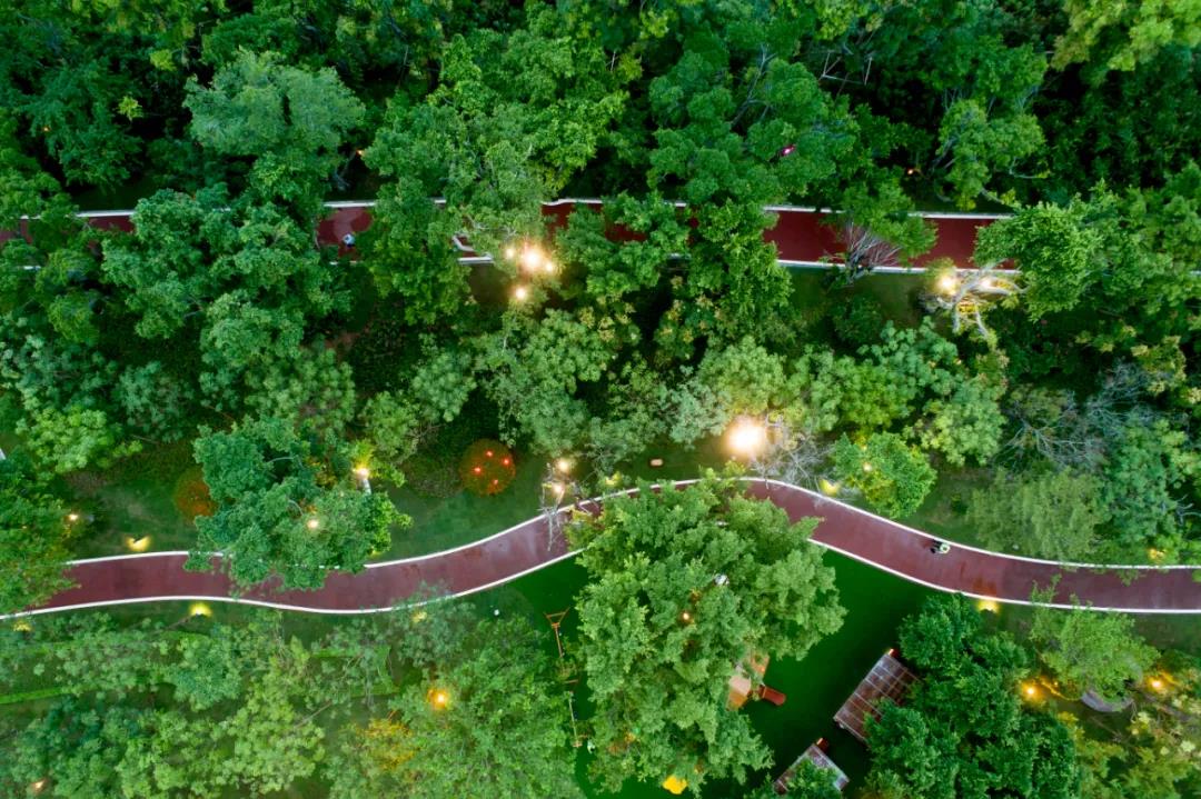 園內樹木成蔭,花景精巧,可謂“人在園中走,如在畫中游”。在公園西南側,由三處廢棄石坑改造成的雞公山瀑布,從30米高的石壁處傾瀉而下,若白虹起舞,營造出鬧市中的親水空間,展現(xiàn)出“銀河倒掛三石梁,香爐瀑布遙相望”的醉人美景。