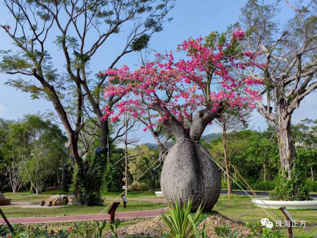 紅粉花朵綴滿枝頭,秀色照人,艷麗的花朵與大大的樹肚互相映襯,讓人感到賞心悅目。
