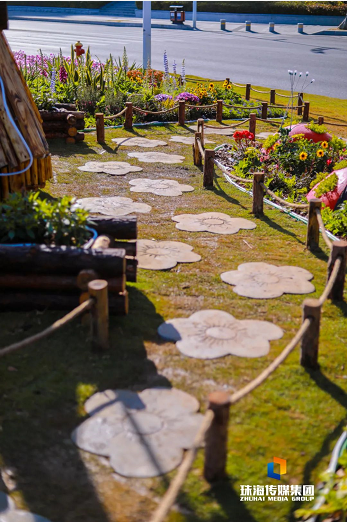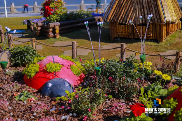 為了增添游人賞花賞景的樂趣,香洲正方還在這里搭建了可愛別致的園林小品,海邊的小木屋配合點綴周邊波斯菊、毛地黃、向日葵,仿佛帶著游人穿越到童話世界。