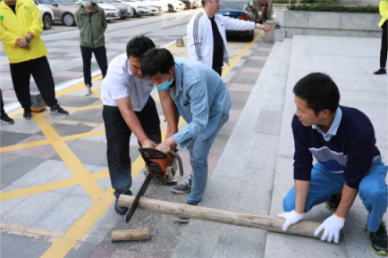 防風(fēng)防汛應(yīng)急知識培訓(xùn)后,全體參訓(xùn)人員在正方·云創(chuàng)園一樓進行應(yīng)急技能實操培訓(xùn),現(xiàn)場實操油鋸鋸木操作、抽水泵抽水等操作。