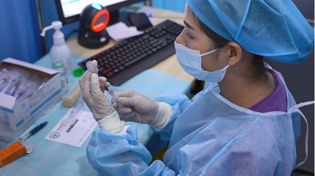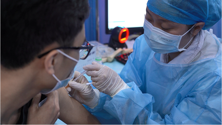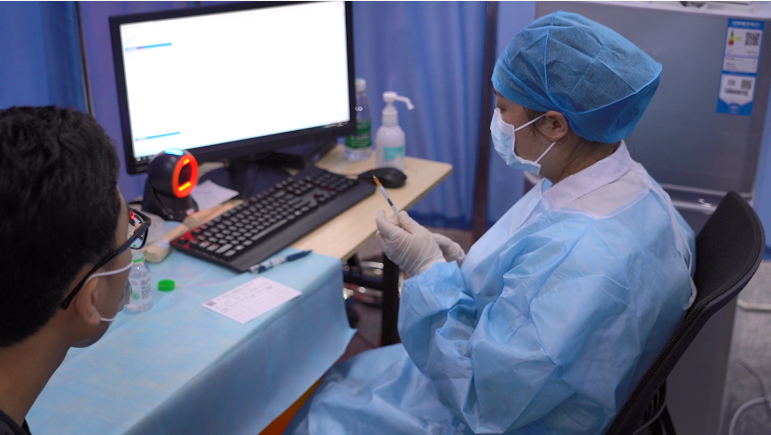 進(jìn)入接種區(qū),醫(yī)護(hù)人員再次核對身份,為對象接種新冠疫苗。