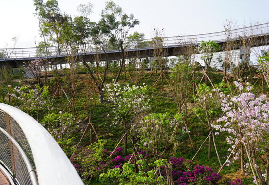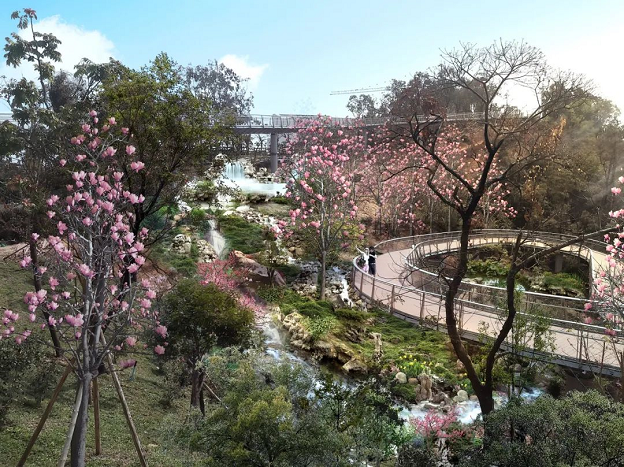 雞公山示范段采用中式園林設(shè)計(jì),山間水景,處處傾注匠心技藝,涓涓溪流順流而下,幽曲別致,信步棧道間。見水、聽聲,卻不見石繞園林花樹,仿佛置身世外桃源。
