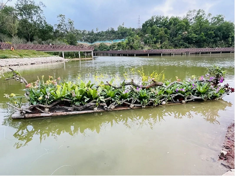 作品描述:作品融合了“雖由人作,宛自天成”的公園整體設(shè)計理念,以及公園尊重自然、保護自然,“節(jié)約優(yōu)先、保護優(yōu)先,自然恢復(fù)為主”的開發(fā)思路,利用枯木塑造了一條龍形的小景,并搭配四盞太陽能射燈,營造白天觀花、夜晚看光的氛圍?!叭嗽趫@中走,如在畫中游“,作品將城市建設(shè)與文化建設(shè)深度融合,將人與自然和諧共融的狀態(tài)體現(xiàn)到作品中,用精巧的技藝把最美的景色呈現(xiàn)給市民游客。