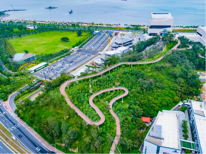 市民游客可從地面入口(珠海規(guī)劃展覽館北側(cè))徒步登上棧道,信步于山海之間,在呼吸“健康”的同時,將海天公園、日月貝、雞公山瀑布等城市美景盡收眼底,達(dá)到觀水觀城、通山達(dá)海、步移景異的景觀效果。