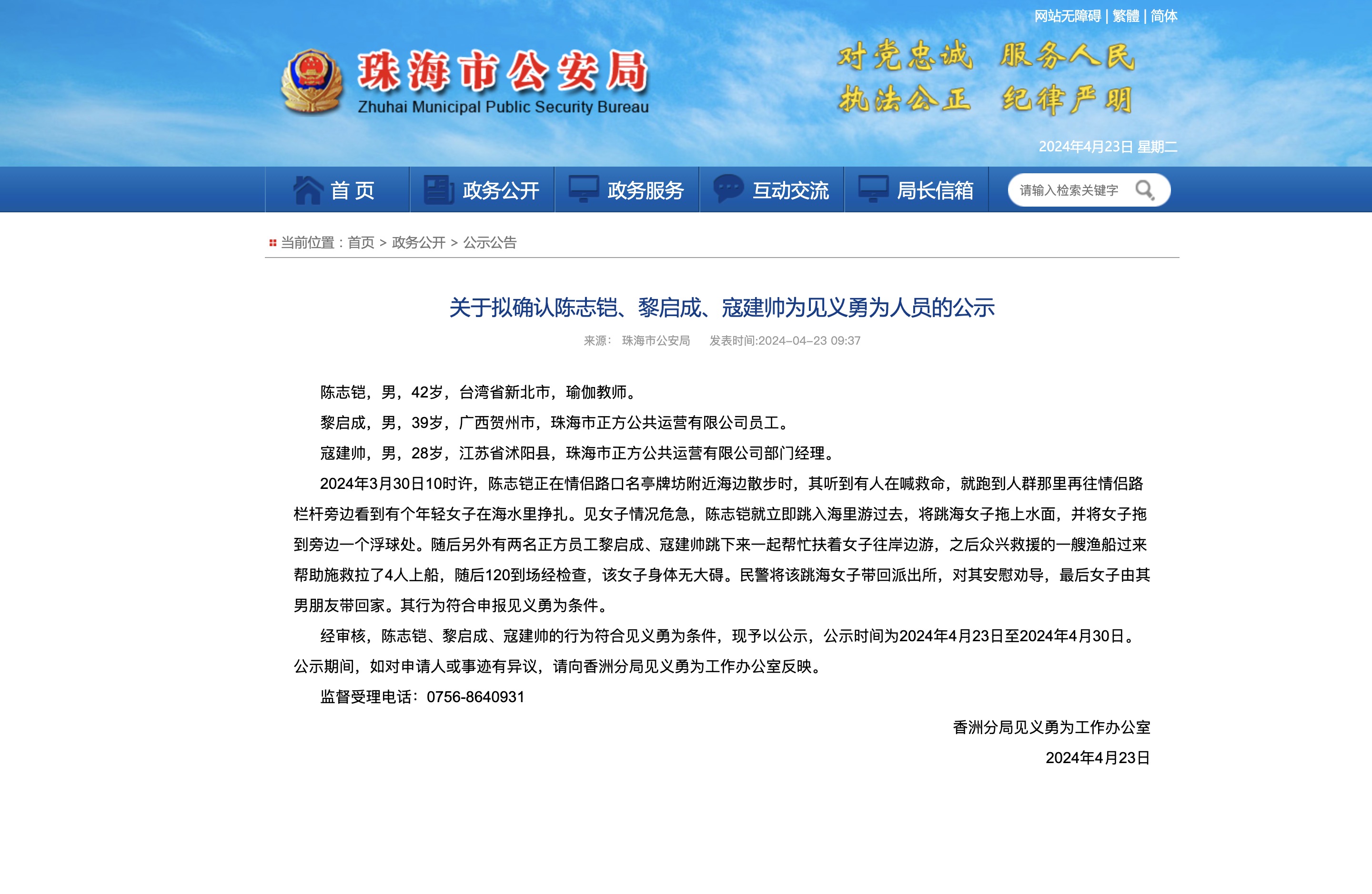 近日,珠海市公安局發(fā)布公示,陳志鎧、黎啟成、寇建帥跳海救人的行為符合見義勇為條件,確認三人為見義勇為人員。
