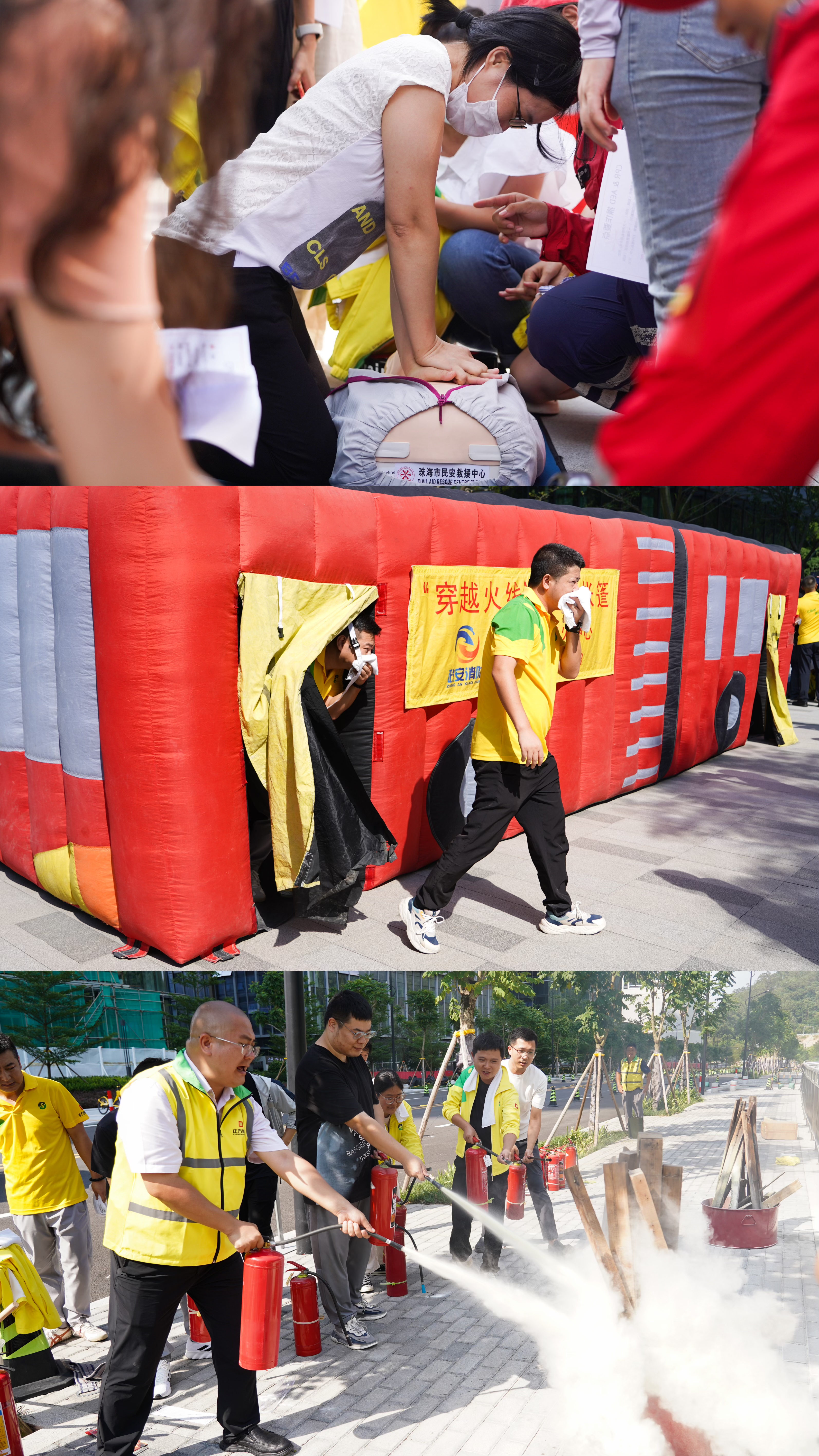 本次消防演練特邀南屏專職消防救援站和珠海市民安救援隊,為員工逐一講解并演示了滅火器和防煙面罩的使用方法、心肺復(fù)蘇及自動體外除顫器(AED)操作步驟等。隨后,在講師的指導(dǎo)下,員工實際體驗了火災(zāi)濃煙暗房逃生、心肺復(fù)蘇及AED實操、滅火器實操滅火等,切實提升自救互助技能和應(yīng)急救護保障能力。