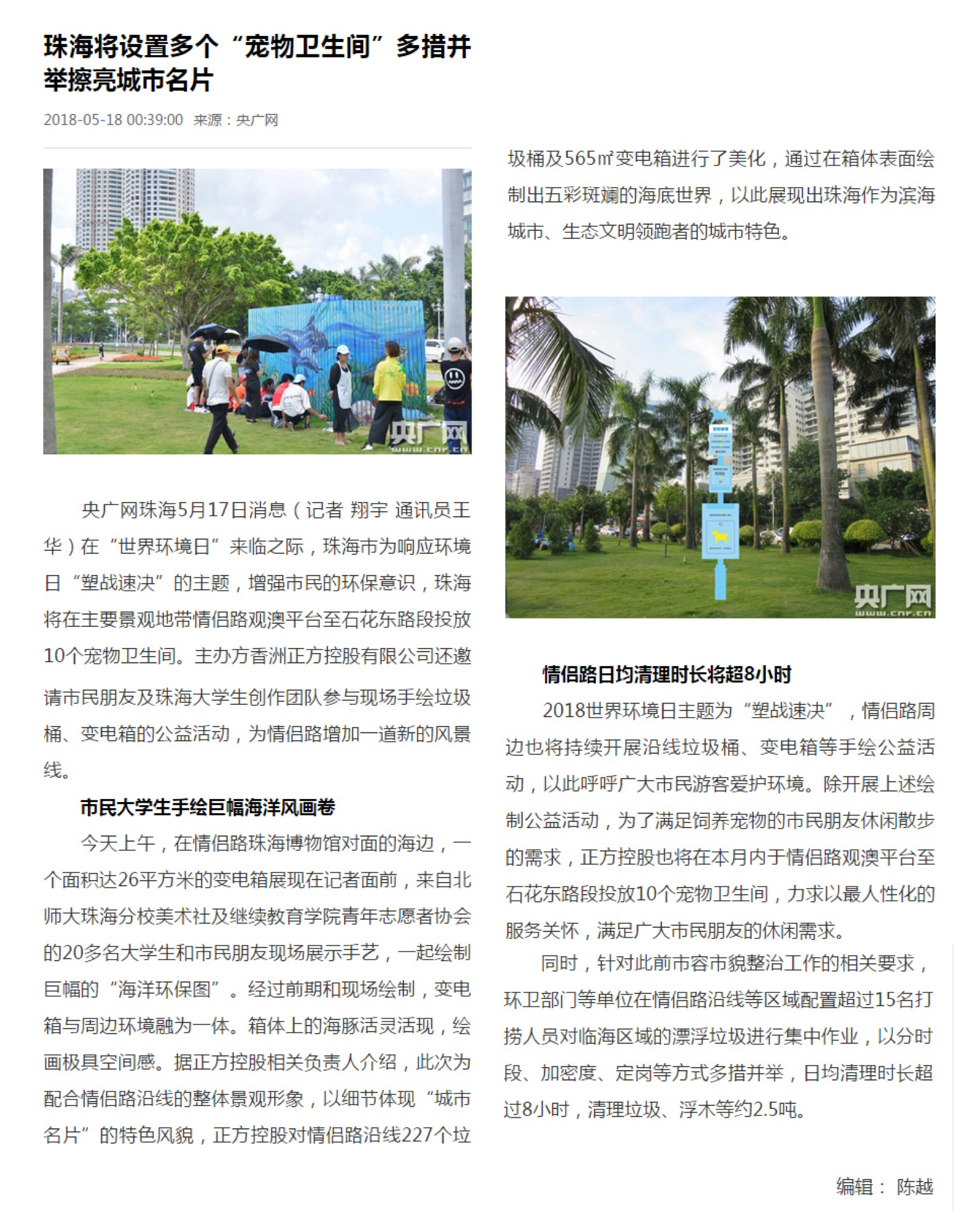央廣網(wǎng)珠海5月17日消息(記者 翔宇 通訊員王華)在“世界環(huán)境日”來(lái)臨之際,珠海市為響應(yīng)環(huán)境日“塑戰(zhàn)速?zèng)Q”的主題,增強(qiáng)市民的環(huán)保意識(shí),珠海將在主要景觀地帶情侶路觀澳平臺(tái)至石花東路段投放10個(gè)寵物衛(wèi)生間。主辦方香洲正方控股有限公司還邀請(qǐng)市民朋友及珠海大學(xué)生創(chuàng)作團(tuán)隊(duì)參與現(xiàn)場(chǎng)手繪垃圾桶、變電箱的公益活動(dòng),為情侶路增加一道新的風(fēng)景線(xiàn)。