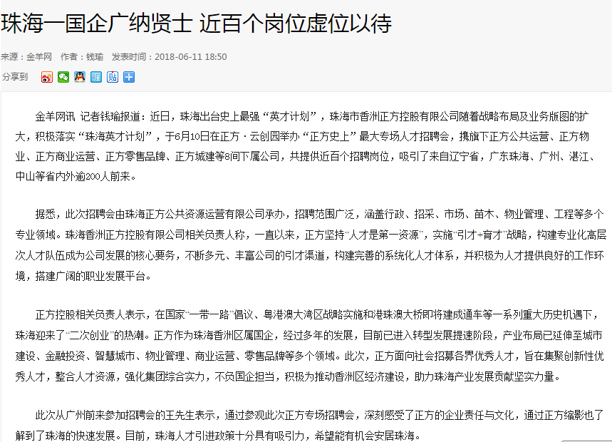 正方控股相關(guān)負(fù)責(zé)人表示,在國家“一帶一路”倡議、粵港澳大灣區(qū)戰(zhàn)略實(shí)施和港珠澳大橋即將建成通車等一系列重大歷史機(jī)遇下,珠海迎來了“二次創(chuàng)業(yè)”的熱潮。正方作為珠海香洲區(qū)屬國企,經(jīng)過多年的發(fā)展,目前已進(jìn)入轉(zhuǎn)型發(fā)展提速階段,產(chǎn)業(yè)布局已延伸至城市建設(shè)、金融投資、智慧城市、物業(yè)管理、商業(yè)運(yùn)營、零售品牌等多個(gè)領(lǐng)域。此次,正方面向社會(huì)招募各界優(yōu)秀人才,旨在集聚創(chuàng)新性優(yōu)秀人才,整合人才資源,強(qiáng)化集團(tuán)綜合實(shí)力,不負(fù)國企擔(dān)當(dāng),積極為推動(dòng)香洲區(qū)經(jīng)濟(jì)建設(shè),助力珠海產(chǎn)業(yè)發(fā)展貢獻(xiàn)堅(jiān)實(shí)力量。