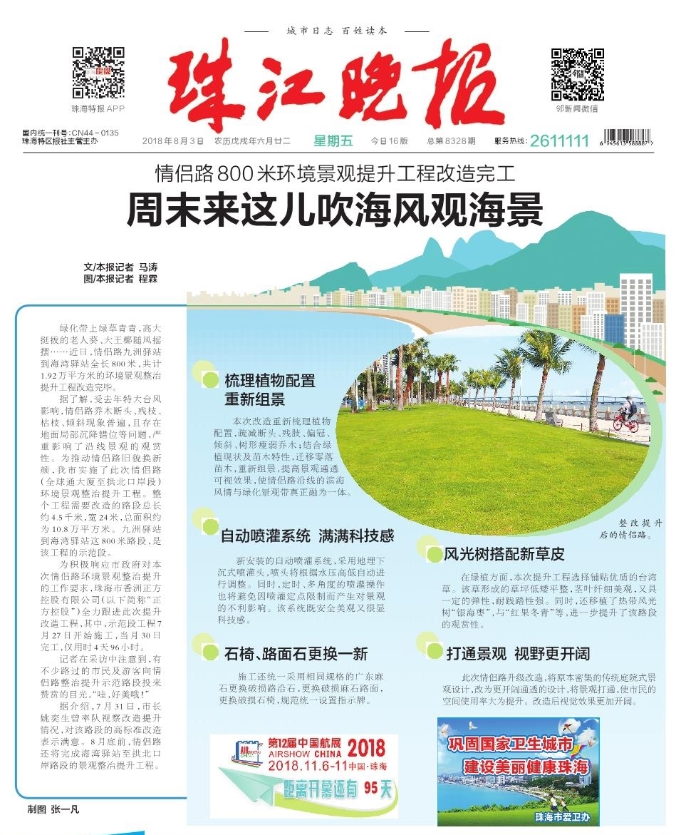 為積極響應(yīng)市政府對(duì)本次情侶路環(huán)境景觀整治提升的工作要求,珠海市香洲正方控股有限公司(以下簡(jiǎn)稱“正方控股”)全力跟進(jìn)此次提升改造工程,其中,示范段工程7月27日開始施工,當(dāng)月30日完工,僅用時(shí)4天96小時(shí)。