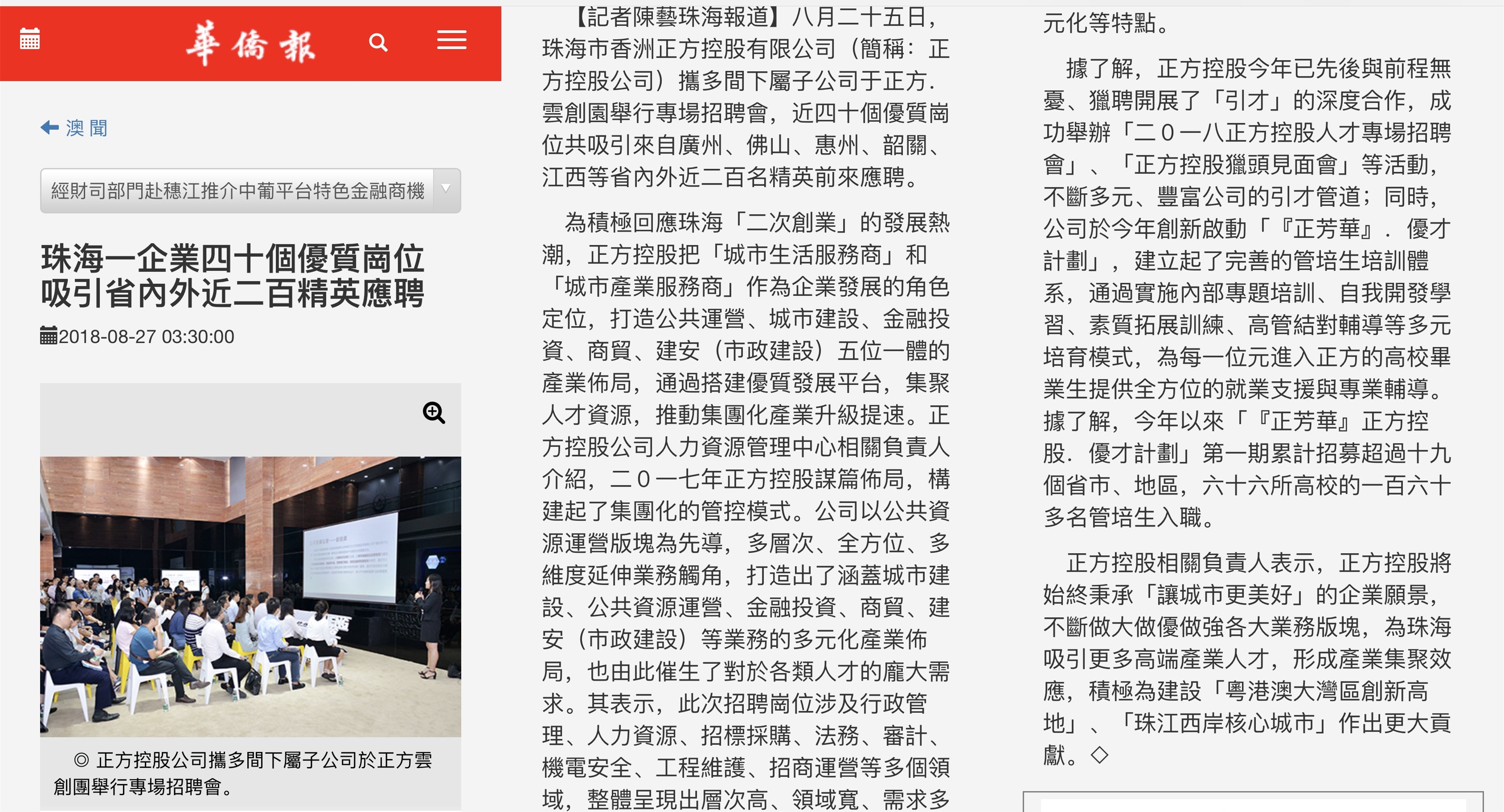 為積極回應(yīng)珠海「二次創(chuàng)業(yè)」的發(fā)展熱潮,正方控股把「城市生活服務(wù)商」和「城市產(chǎn)業(yè)服務(wù)商」作為企業(yè)發(fā)展的角色定位,打造公共運(yùn)營、城市建設(shè)、金融投資、商貿(mào)、建安(市政建設(shè))五位一體的產(chǎn)業(yè)布局,通過搭建優(yōu)質(zhì)發(fā)展平臺,集聚人才資源,推動集團(tuán)化產(chǎn)業(yè)升級提速。正方控股公司人力資源管理中心相關(guān)負(fù)責(zé)人介紹,二0一七年正方控股謀篇布局,構(gòu)建起了集團(tuán)化的管控模式。公司以公共資源運(yùn)營版塊為先導(dǎo),多層次、全方位、多維度延伸業(yè)務(wù)觸角,打造出了涵蓋城市建設(shè)、公共資源運(yùn)營、金融投資、商貿(mào)、建安(市政建設(shè))等業(yè)務(wù)的多元化產(chǎn)業(yè)布局,也由此催生了對于各類人才的龐大需求。其表示,此次招聘崗位涉及行政管理、人力資源、招標(biāo)采購、法務(wù)、審計(jì)、機(jī)電安全、工程維護(hù)、招商運(yùn)營等多個(gè)領(lǐng)域,整體呈現(xiàn)出層次高、領(lǐng)域?qū)?、需求多元化等特點(diǎn)。