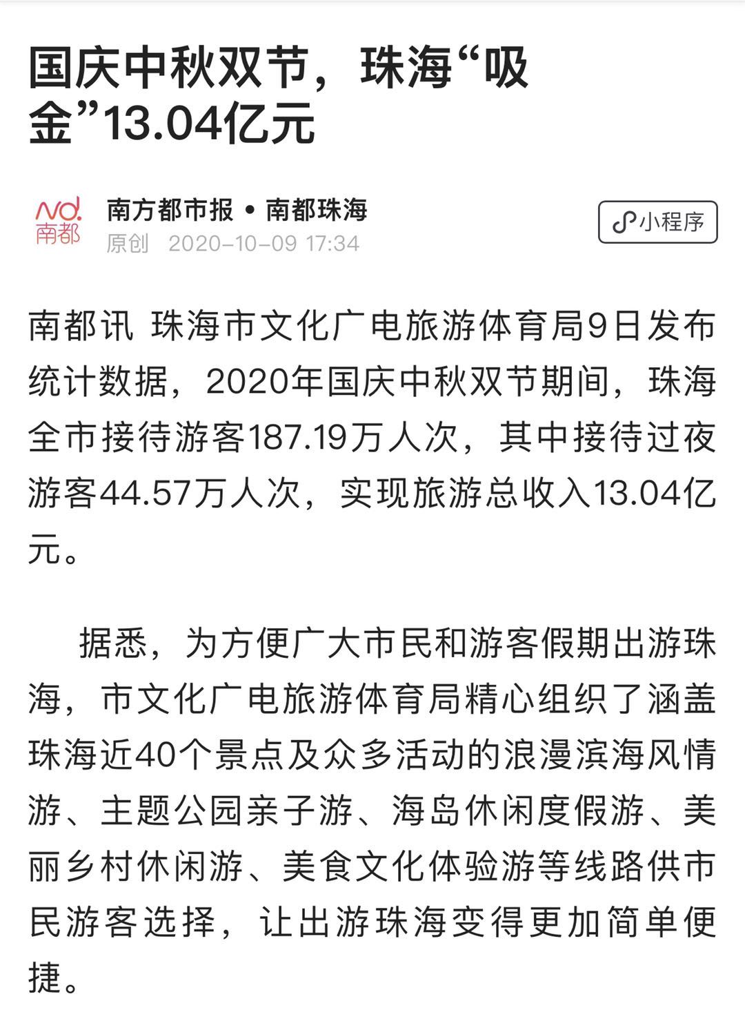 珠海市文化廣電旅游體育局9日發(fā)布統(tǒng)計數(shù)據(jù),2020年國慶中秋雙節(jié)期間,珠海全市接待游客187.19萬人次,其中接待過夜游客44.57萬人次,實現(xiàn)旅游總收入13.04億元。